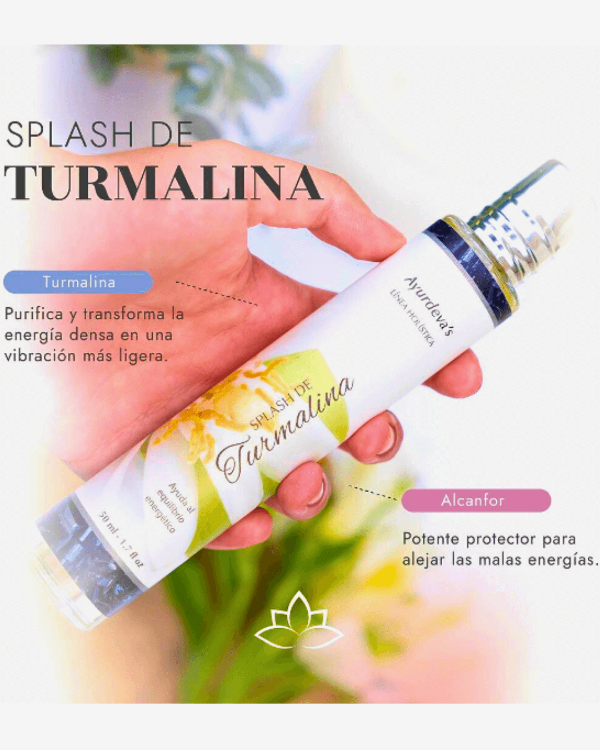 El Splash Áurico de Turmalina de Ayurdevas combina la energía de la turmalina negra, conocida por su capacidad de protección y descarga energética, con una base de aceites esenciales naturales formulados para acompañar procesos de limpieza y equilibrio.
