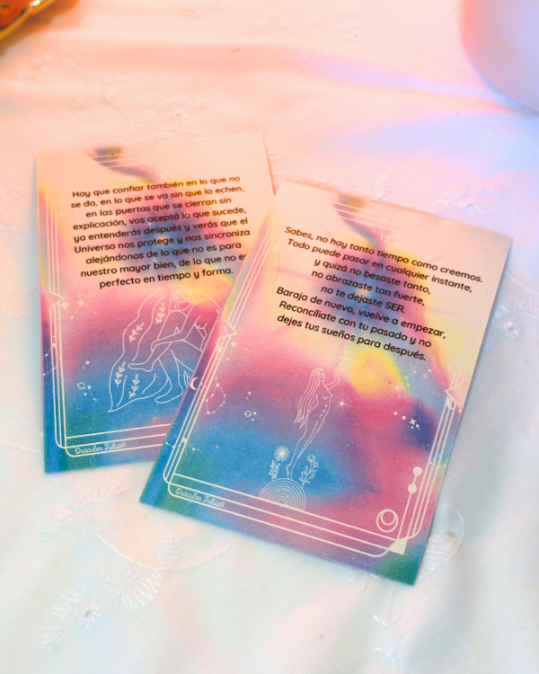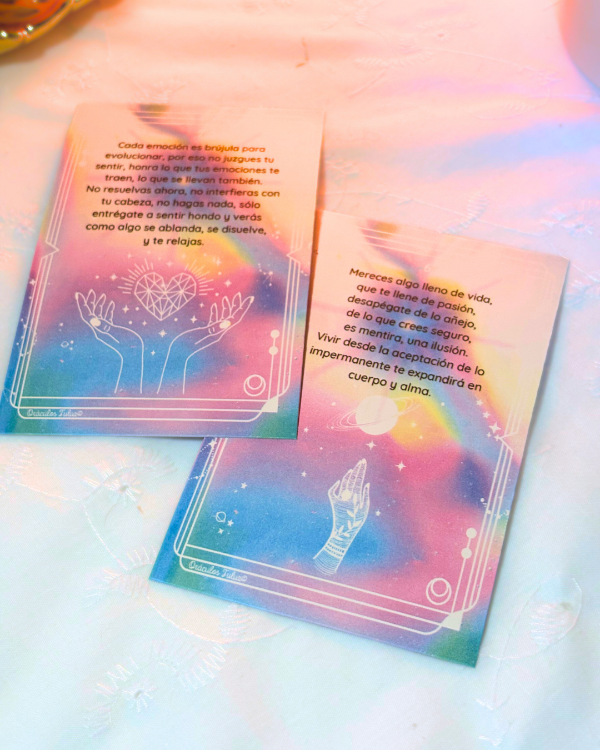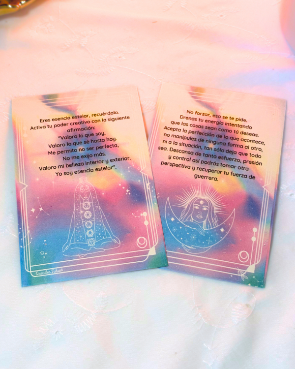Un Oráculo con 22 mensajes canalizados para activar nuestra esencia estelar. Cortos, claros, profundos y certeros, los mensajes te guiarán a comenzar, finalizar, continuar ciclos, cambiar actitudes, sanar heridas y más. Sirven para comenzar, desarrollar y cerrar sesiones de Registros Akáshicos, lecturas de Tarot, cartas natales, runas, constelaciones, meditaciones, consultas terapéuticas en general y para toda persona que sienta el llamado de consultar a una herramienta conectiva con su sabiduría interior y el Universo. Las cartas están creadas con la intención de sincronizar momentos y hacer puente entre alma, cuerpo y mente.