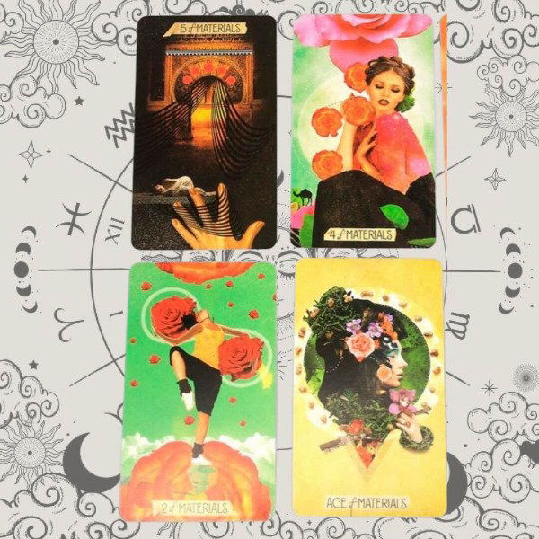 A diferencia de los tarots convencionales, los palos de la baraja se presentan aquícon nuevos nombres que reejan mejor sus energías elementales: las copas se han convertido en Emociones, los bastos en Inspiración, las espadas en Voces y los oros en