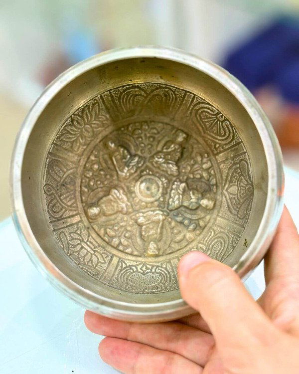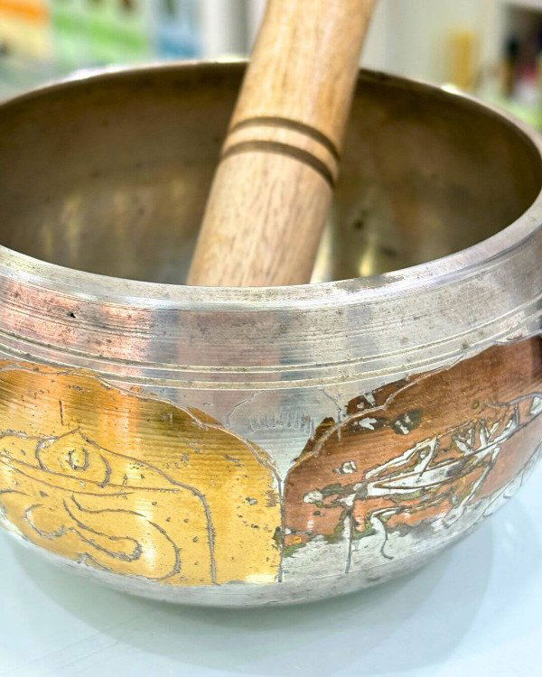 Cuenco tibetano de 7 metales, 11,5 cm de diámetro. Importado de India. En terminaciones doradas, plateadas y color cobre. Se trata de un producto artesanal cuyos detalles finales se hacen a mano. El interior tiene diferentes grabados. incluye su baqueta de madera. Si necesitas mas especificaciones no dudes en consultarnos!