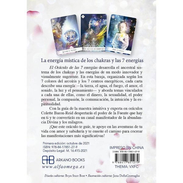 El Oráculo de las 7 energías desarrolla el ancestral sistema de los chakras y las energías de un modo innovador y visualmente sugerente. En esta baraja, organizada según los 7 colores del arcoíris y los 7 centros energéticos, cada carta describe una energía la tierra, el agua, el fuego, el amor, el sonido, la luz y el pensamiento y aborda temas vinculados a cada una de ellas, como el dinero, la sexualidad, el poder personal, la compasión, la comunicación, la intuición y la espiritualidad.