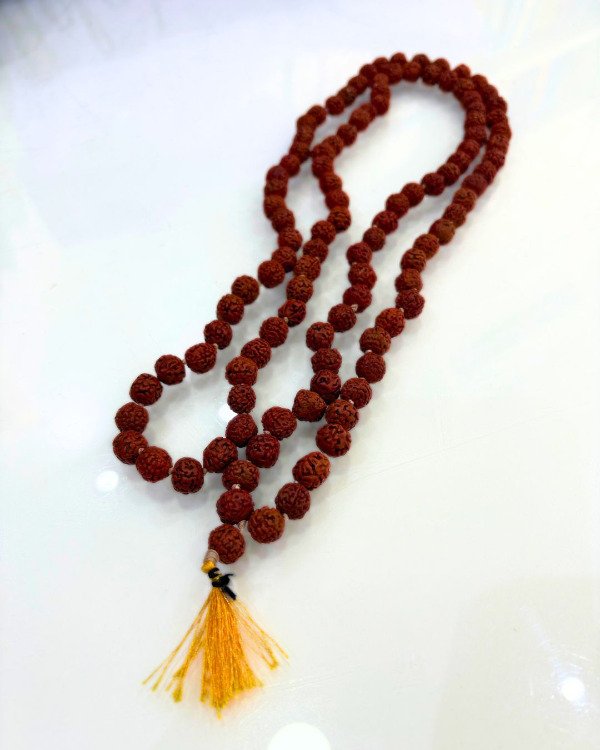 Japamala de semillas de rudraksha con 108 cuentas. El color final puede variar.