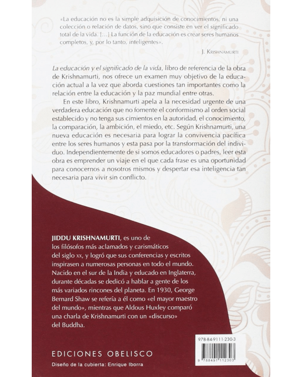 📖 En este libro, Krishnamurti apela a la necesidad urgente de una verdadera educación que no fomente el conformismo al orden social establecido y no tenga sus cimientos en la autoridad, el conocimiento, la comparación, la ambición, el miedo, etc.
