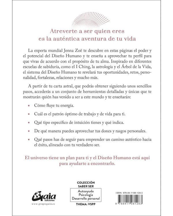 La experta mundial Jenna Zoë te descubre en estas páginas el poder y el potencial del Diseño Humano y te enseña a aprovechar tu perfil para que vivas de acuerdo con el propósito de tu alma. Inspirado en diferentes escuelas de sabiduría, como el I Ching, la astrología y el Árbol de la Vida, el sistema del Diseño Humano te revelará tus oportunidades, retos, personalidad, fortalezas, relaciones y mucho más.