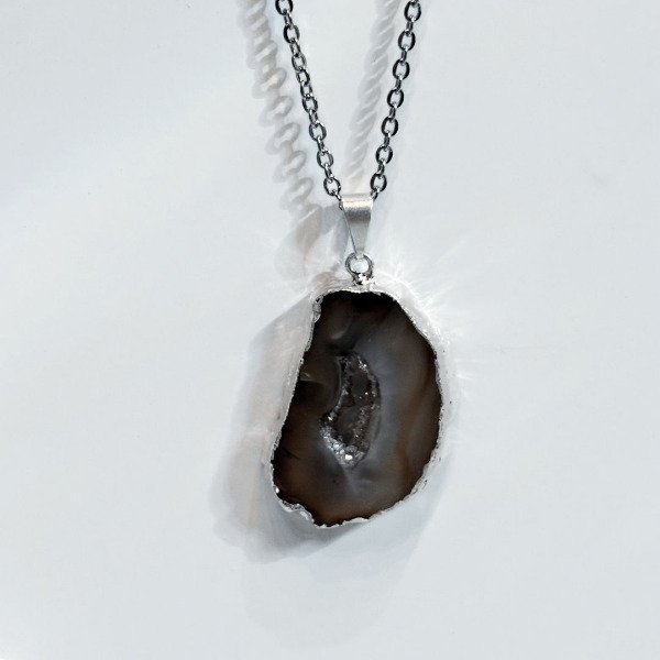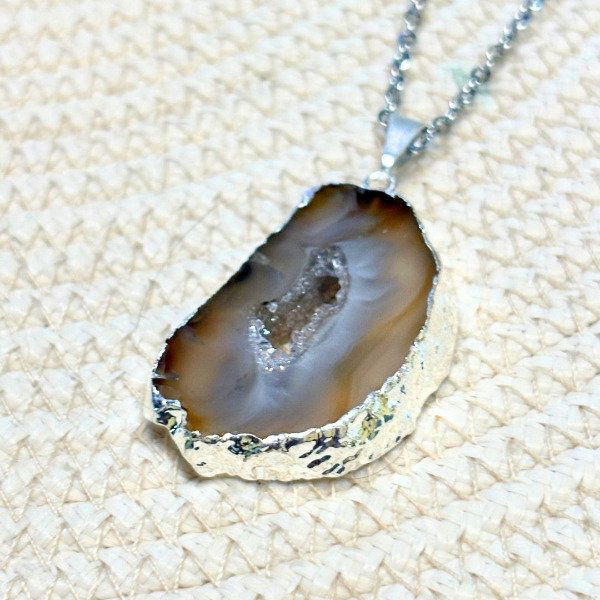 Descubrí el poder natural del Amuleto collar geoda de ágata, una pieza única que combina belleza orgánica y energía equilibrante. Cada geoda de ágata es una formación natural de bandas vibrantes de sílice y cristales internos que promueven estabilidad emocional, conexión a tierra y bienestar integral. El uso de ágata en joyería es ancestral, apreciada por su capacidad para fortalecer la calma y aportar equilibrio en momentos de tensión o agitación.