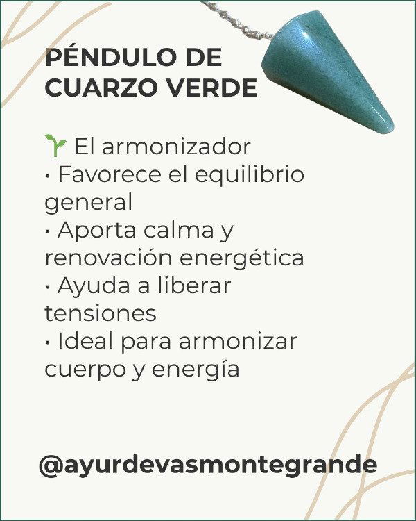 El péndulo de cuarzo verde es una herramienta energética asociada a la sanación, el equilibrio y la armonización del cuerpo y la mente. El cuarzo verde natural es reconocido por su vibración regeneradora, ideal para trabajos de bienestar integral y equilibrio emocional.