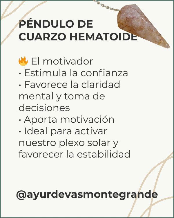 El péndulo de cuarzo hematoide amarillo es una herramienta energética que integra la potencia amplificadora del cuarzo cristal con la energía vital y activadora de la hematite, manifestada en tonos amarillos asociados al poder personal y la acción consciente. El cuarzo hematoide amarillo natural es reconocido por estimular la confianza, la claridad mental y el equilibrio entre mente y emoción.