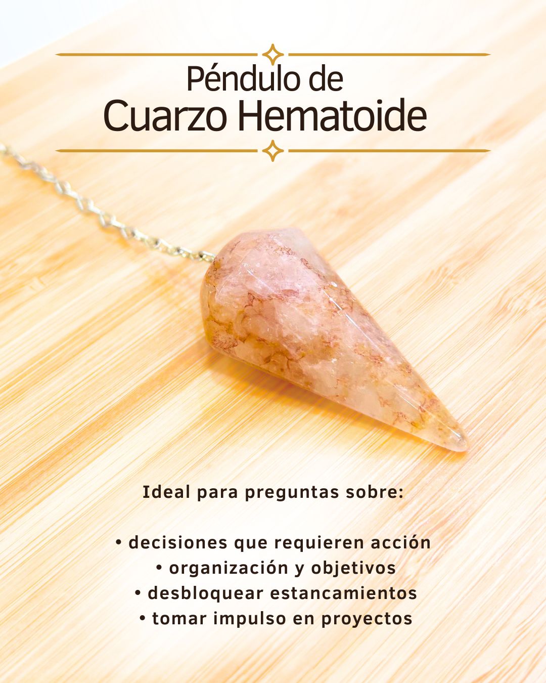 Este péndulo es ideal para prácticas de radiestesia, activación del chakra plexo solar, trabajos de enfoque, motivación y ordenamiento energético. Su vibración dinámica ayuda a disipar bloqueos relacionados con la inseguridad, el miedo a la acción y la falta de dirección, favoreciendo decisiones firmes y alineadas.