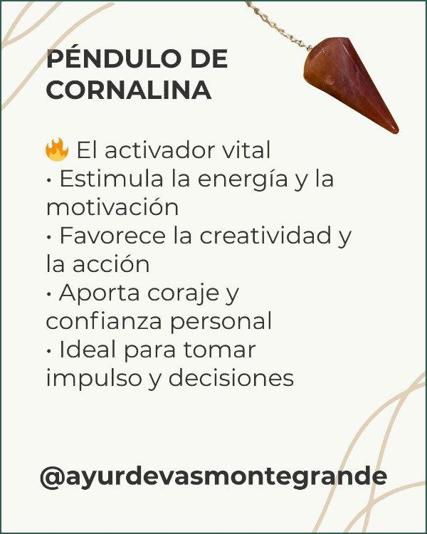El péndulo de cornalina es una herramienta energética asociada a la vitalidad, la acción y la creatividad. La cornalina natural es conocida por su energía cálida y estimulante, ideal para activar la fuerza interior, la motivación y el impulso necesario para avanzar en proyectos y decisiones.