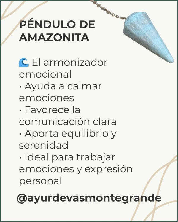 El péndulo de amazonita es una herramienta energética asociada al equilibrio emocional, la comunicación consciente y la armonía interior. La amazonita natural es conocida por su vibración calmante y protectora, ideal para suavizar emociones intensas, liberar tensiones y promover la expresión auténtica desde el corazón.