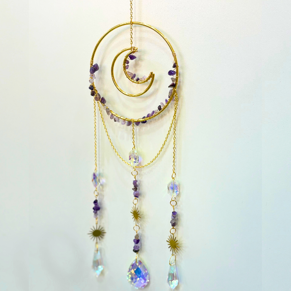 Atrapasol de 45 cm de largo, con argolla para colgar y luna con piedras de amatista.