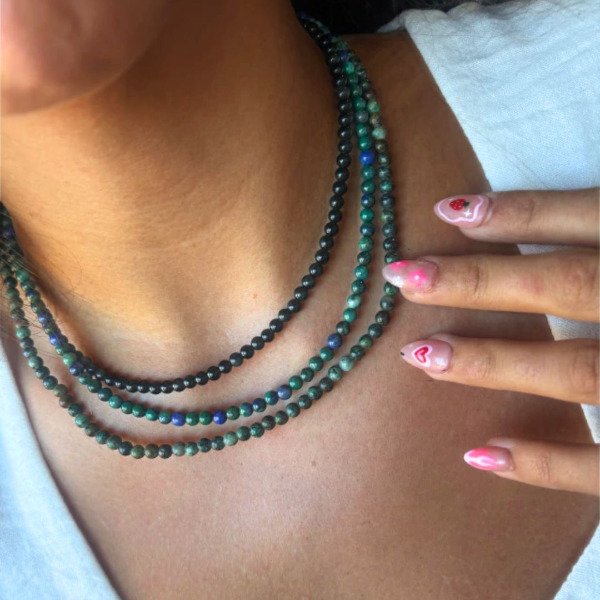 El collar de bolitas de azurita es una joya energética ideal para quienes buscan conectar con su intuición, potenciar la claridad mental y abrirse a una percepción más elevada.