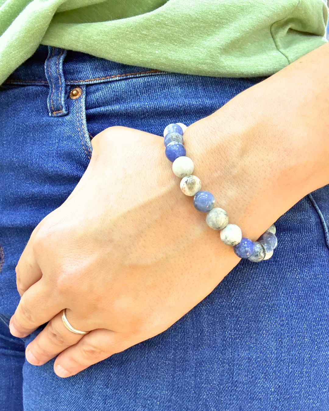 Pulsera elastizada de Sodalita natural. La sodalita fomenta la claridad mental, la paciencia y la intuición. Se asocia con el chakra de la garganta y el tercer ojo, promoviendo la autoexpresión, la lógica y la calma, siendo ideal para la meditación y para liberar antiguos patrones mentales.