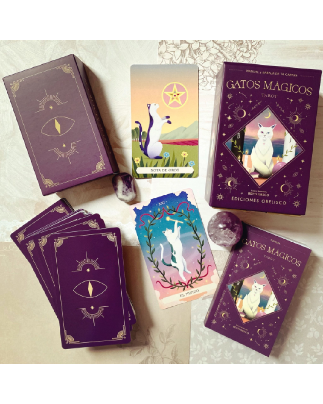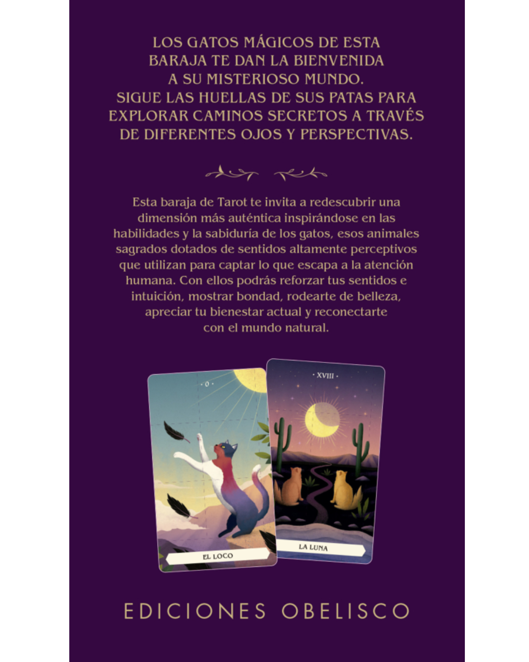 El Tarot de los Gatos Mágicos de Editorial Obelisco es un encantador mazo de tarot que combina la sabiduría simbólica del tarot con el misterioso y fascinante mundo de los gatos. Sus ilustraciones muestran a estos animales en escenas mágicas y simbólicas que invitan a interpretar las cartas desde una mirada intuitiva y lúdica.